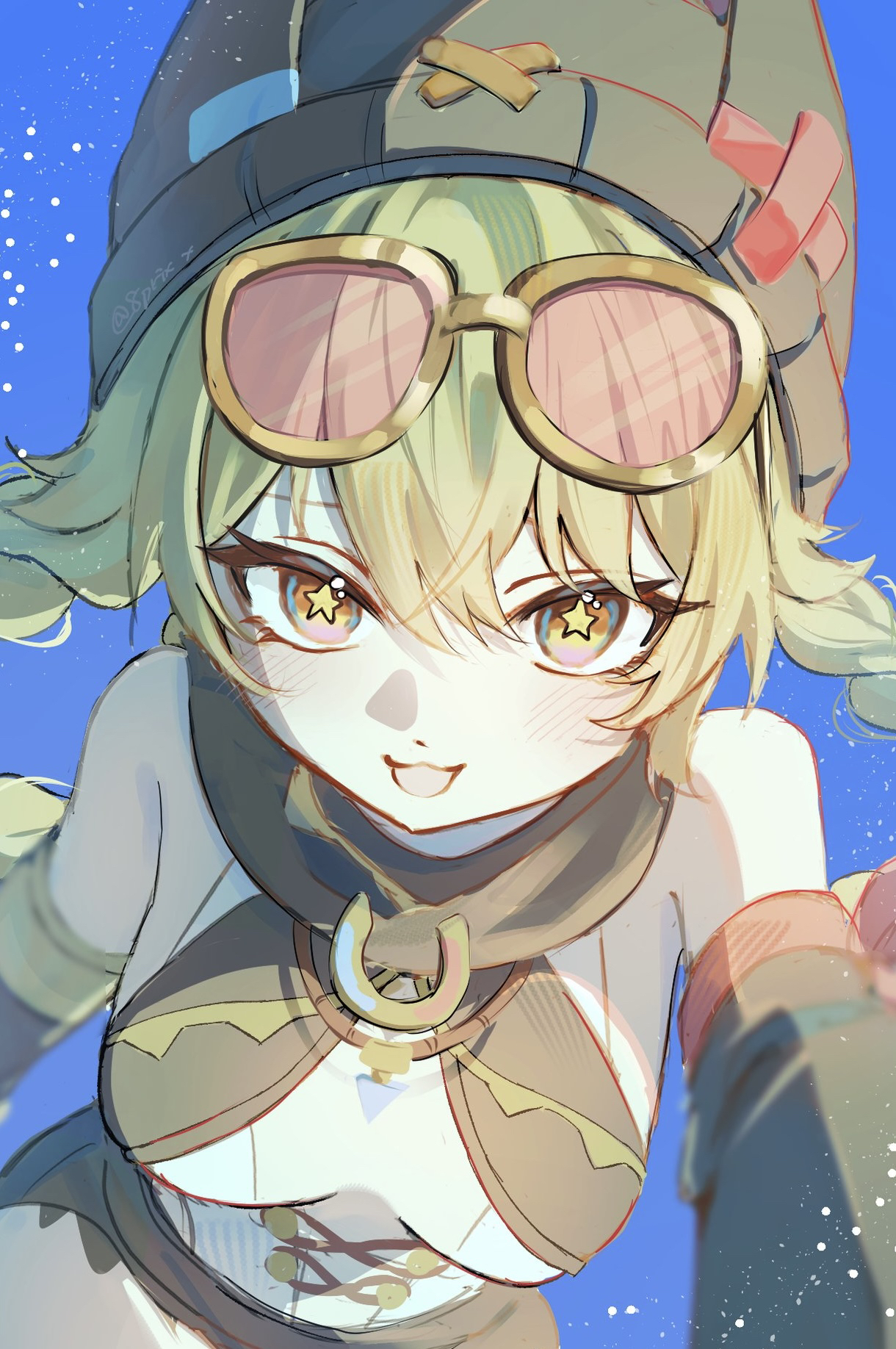 :d1girl8prix xbent overblack hatblack shortsblack sleevesblonde hairblue backgroundbraidbreastsbrown eyesdetached sleeveseyewear on headhatleotardlong hairmedium breastsmicro shortsopen mouthpink-tinted eyewearshortsskin tightsmilesolostar (symbol)star-shaped pupilssymbol-shaped pupilstinted eyeweartwin braidswhite leotardyellow-framed eyewear