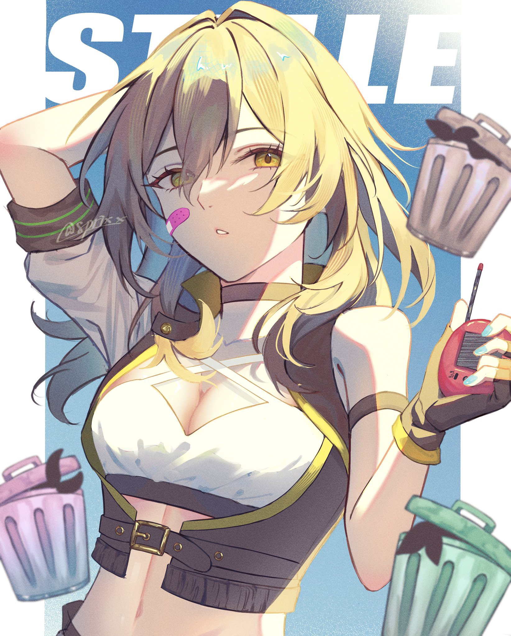1girl8prix xarm behind headarm strapblack chokerblack glovesblack jacketblonde hairblue nailsbrabreastsbrown eyescharacter namechokercleavagecrop topcrossed bangsfingerless glovesglovesgrey sleeveshair between eyeshair intakesholdingjacketlooking at viewermedium breastsmidriffnail polishnavelopen clothesopen jacketparted lipsshort sleevessingle sleevesolostomachunderwearupper bodywhite bra