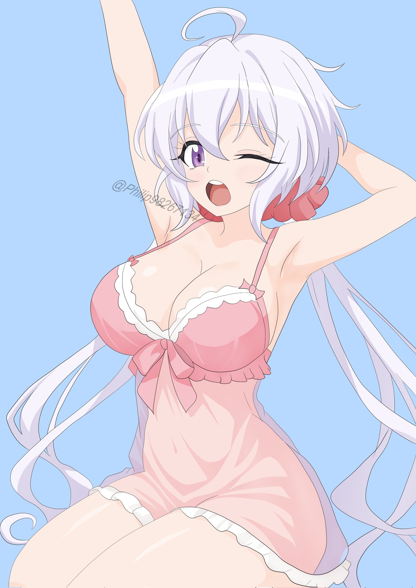 1girlahogearm behind headarmpitsblue backgroundbrabreastscamisolecleavagecovered navelhair between eyeshair ornamenthair scrunchielong hairlooking at vieweropen mouthpink brapink camisolepurple eyesscrunchiesimple backgroundsittingsolostretchingteethunderwearupper teeth onlyvery long hairwhite hair