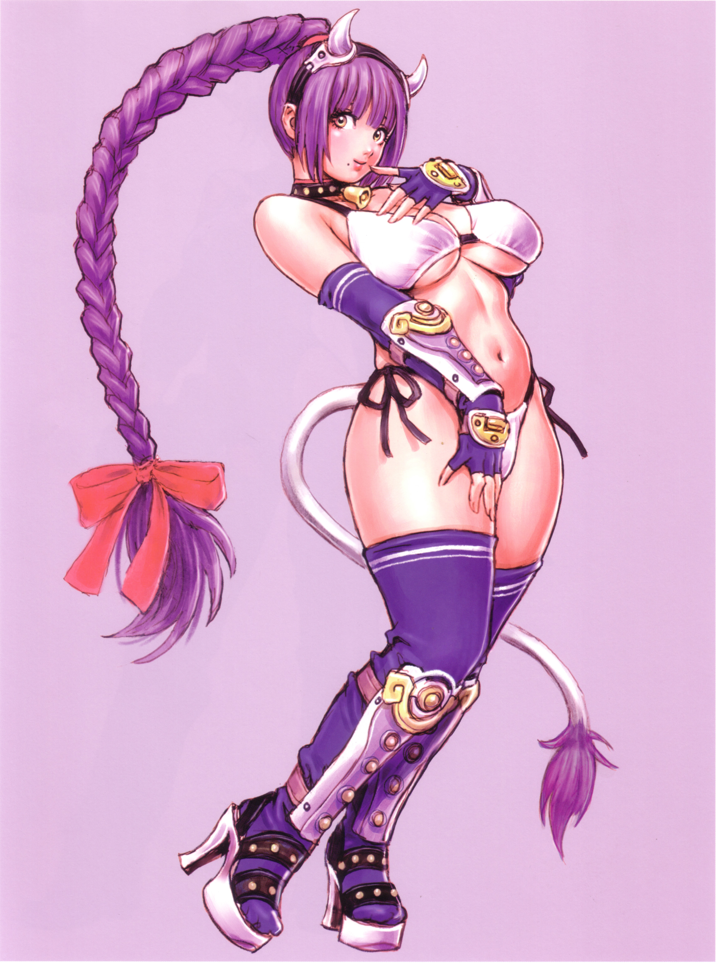 1girlbellbikinibraidbreastscollarcow girlcow tailcurvyfemale focusgloveshigh heelshornslarge breastslong hairmoleneck bellplatform shoespurple bikinipurple hairshoesside-tie bikini bottomsoloswimsuittailthighhighsunderboobvery long hairwhite shoesyellow eyes