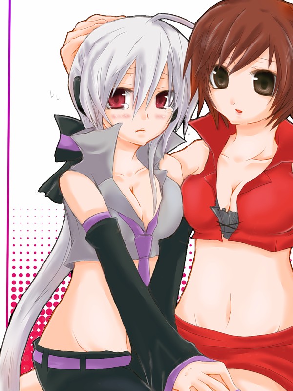 2girlsahogeblouseblushbreastsbrown eyesbrown haircleavagedetached sleevesfrowngrey shirtheadpatlong hairmultiple girlsnavelnecktiepencil skirtponytailred eyesshirtshort hairskirttearsvery long hairwhite hair