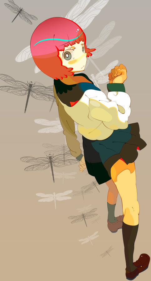 1girlbugdragonflyexpressionlessfemale focusfull bodyinsectkneepitsloaferslooking at viewerpink hairschool uniformserafukushoesshort hairsolostanding