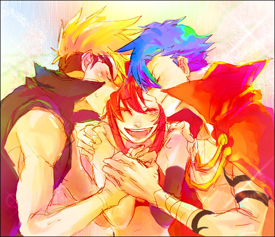 00s1girl2boysblonde hairblue hairclosed eyesholding handskissmultiple boysopen mouthred hairsmile