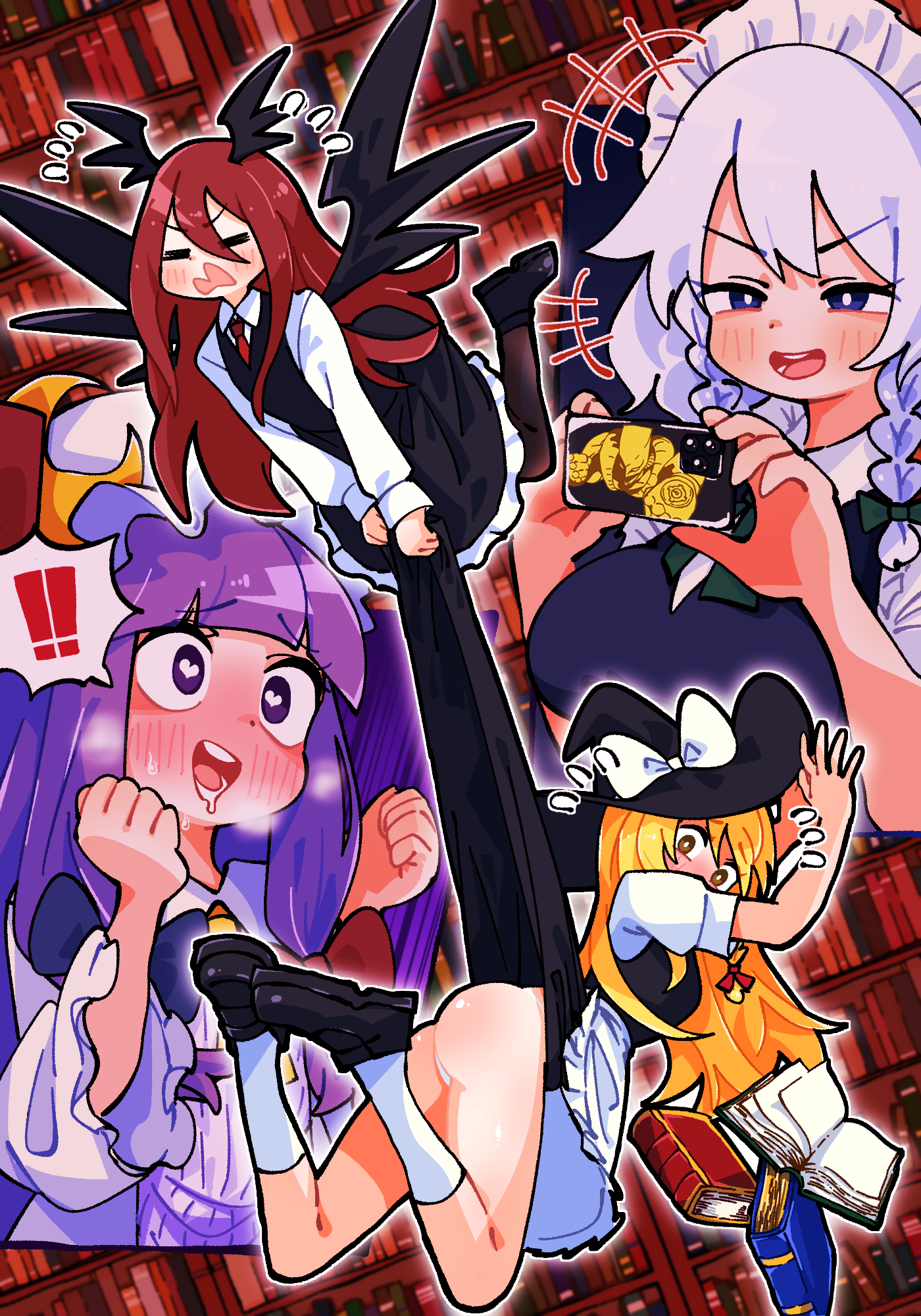 1boy4girlsapronassblack hatblack shoesblack skirtblack vestblonde hairblue bowblue eyesblushbookbookshelfbowbraidbreastsbrown pantyhosecharacter printclosed eyesclothes grabcrescentcrescent hat ornamentdemon wingsembarrassedflyingflying sweatdropsgreen bowgrey hairhair bowhathat bowhat ornamenthead wingsheartheart-shaped pupilslarge breastsloaferslong hairlong sleevesmaidmaid headdressmob capmultiple girlsnecktieopen mouthpantiespantyhosepurple eyespurple hairred bowred hairred necktieshoesside braidsingle braidskirtskirt grabskirt setsmartphone casesmilesocksspoken exclamation marksymbol-shaped pupilstwin braidsunderwearvery long hairvestwaist apronwhite apronwhite bowwhite pantieswhite sockswingswitch hatyellow eyes