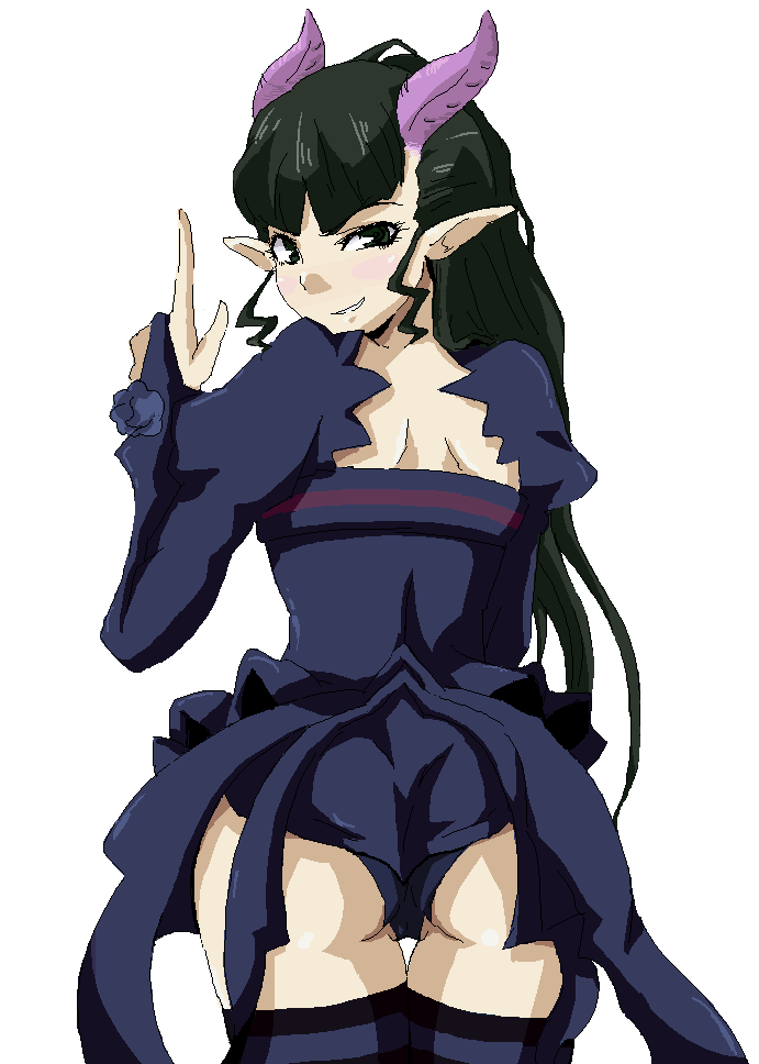 00sassblushdetached sleevesdresshornslong hairlooking backoekakipantiespointy earssmirksolostriped clothesstriped thighhighsthighhighsunderwear