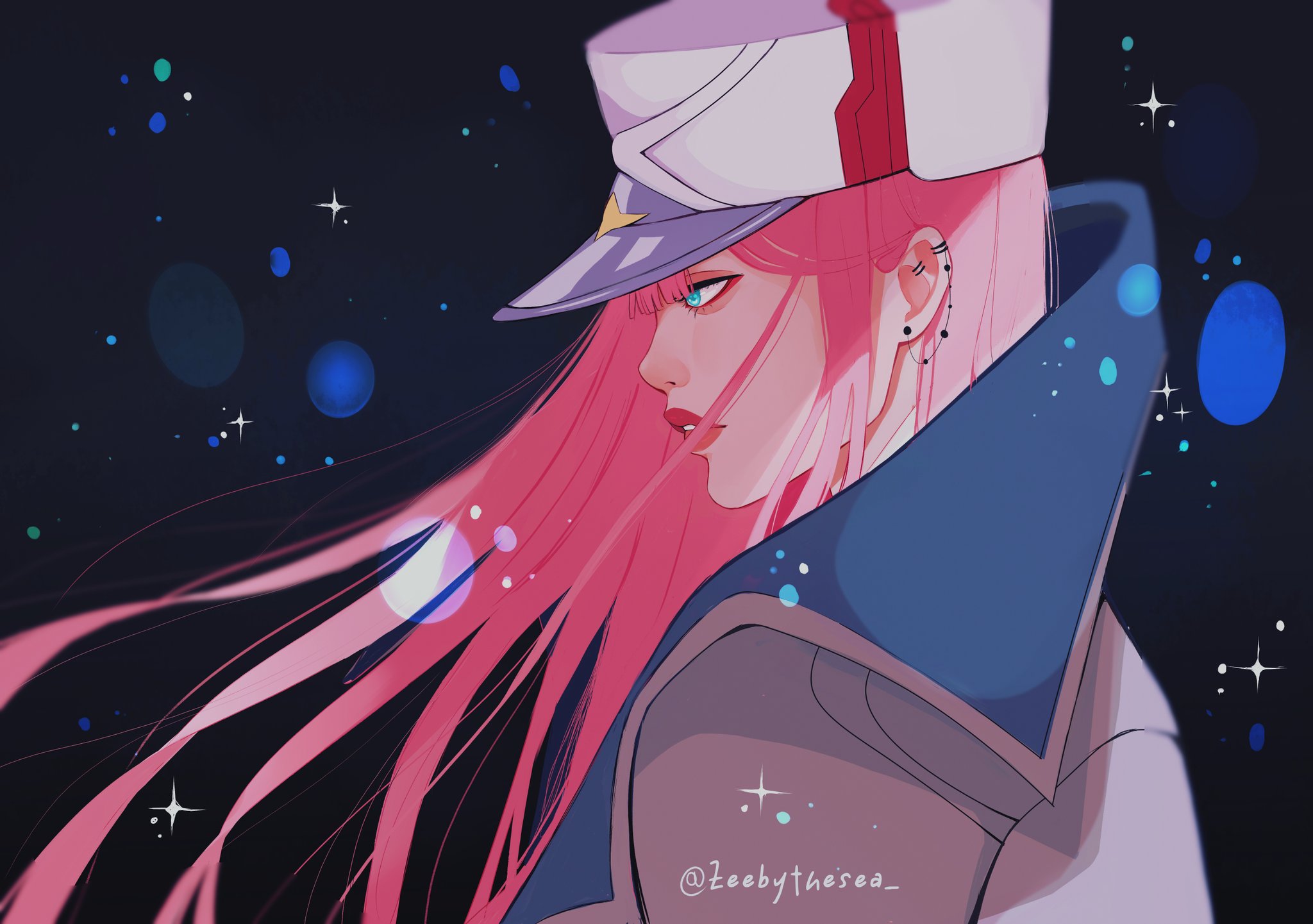 1girlaegyo salaqua eyesasianblack backgroundblunt bangsblurrycoatcolored lapelsdepth of fieldear piercingeyelasheseyelinerfloating hairfrom sidehatlapelslight particleslooking aheadmakeupmilitary hatparted lipspiercingpink hairprofilered eyelinersparkletwitter usernameupper bodywhite coat