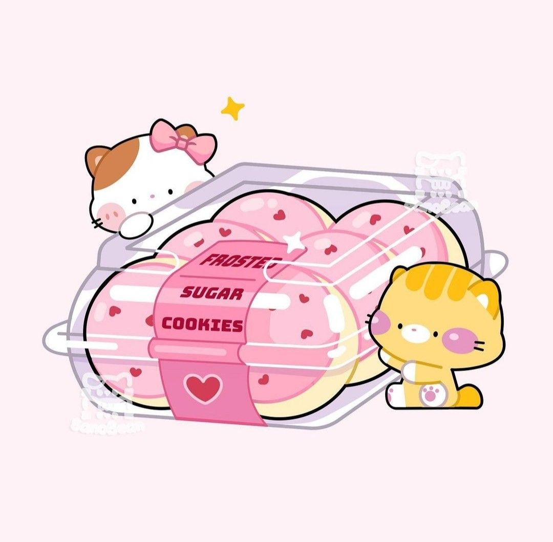 animal focusblack eyesblush stickersbowboxcatcookiefoodfood focusicingno humanspawpadspink backgroundpink bowsimple backgroundsittingsolid circle eyessparklesprinkleswatermarkwhiskers