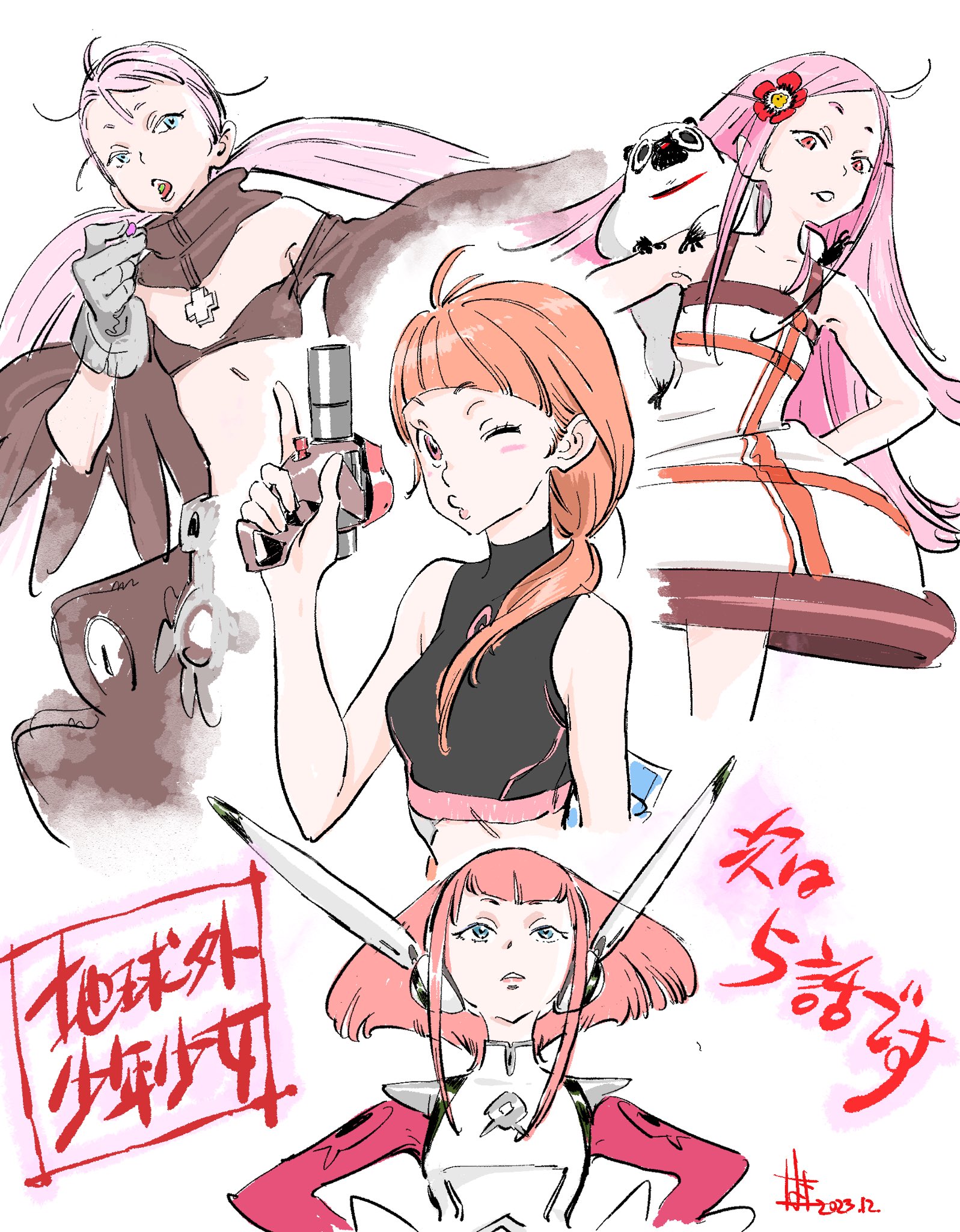 4girlsbodysuitcreator connectiondateddressflowerhair flowerhair ornamentlong hairlooking at viewermultiple girlsnasa houstonone eye closedpink eyespink hairpuckered lipssimple backgroundwhite background