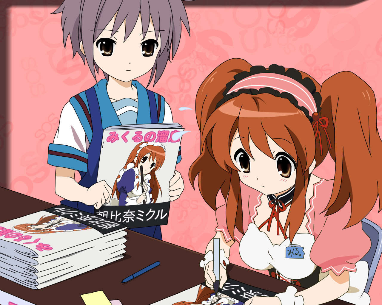 michii yuuki, asakura ryoko, suzumiya haruhi no yuuutsu, 00s, 1girl, buruma, female focus, gym uniform, long hair, monochrome, outstretched arms, purple theme, sketch, solo, spread arms