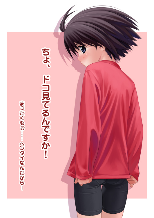 00sandrogynousantenna hairbackbike shortsblushbrown hairlooking backpantylinesreverse trapshirt tugshort hairsolo