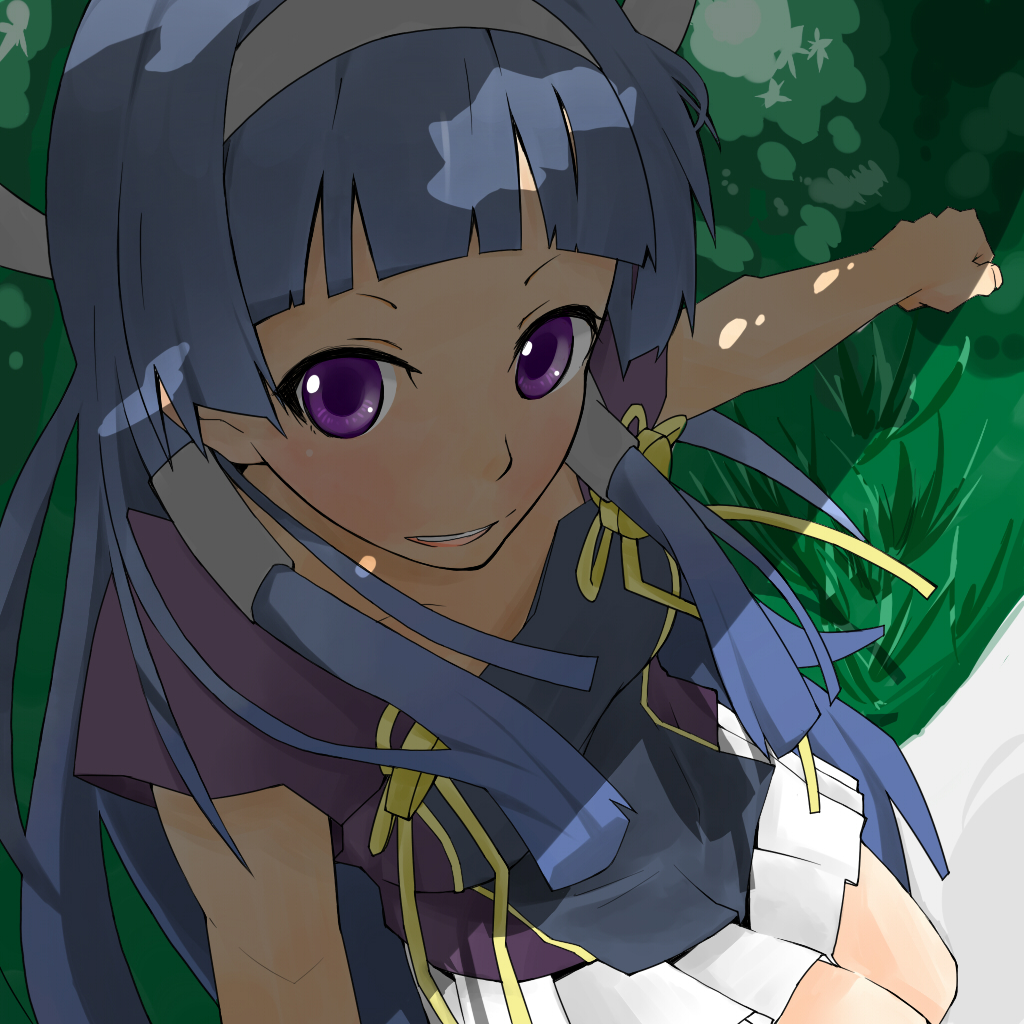 00s1girlblue hairblunt bangsfemale focushairbandlong hairpleated skirtpurple eyesshadowskirtsolowhite skirt