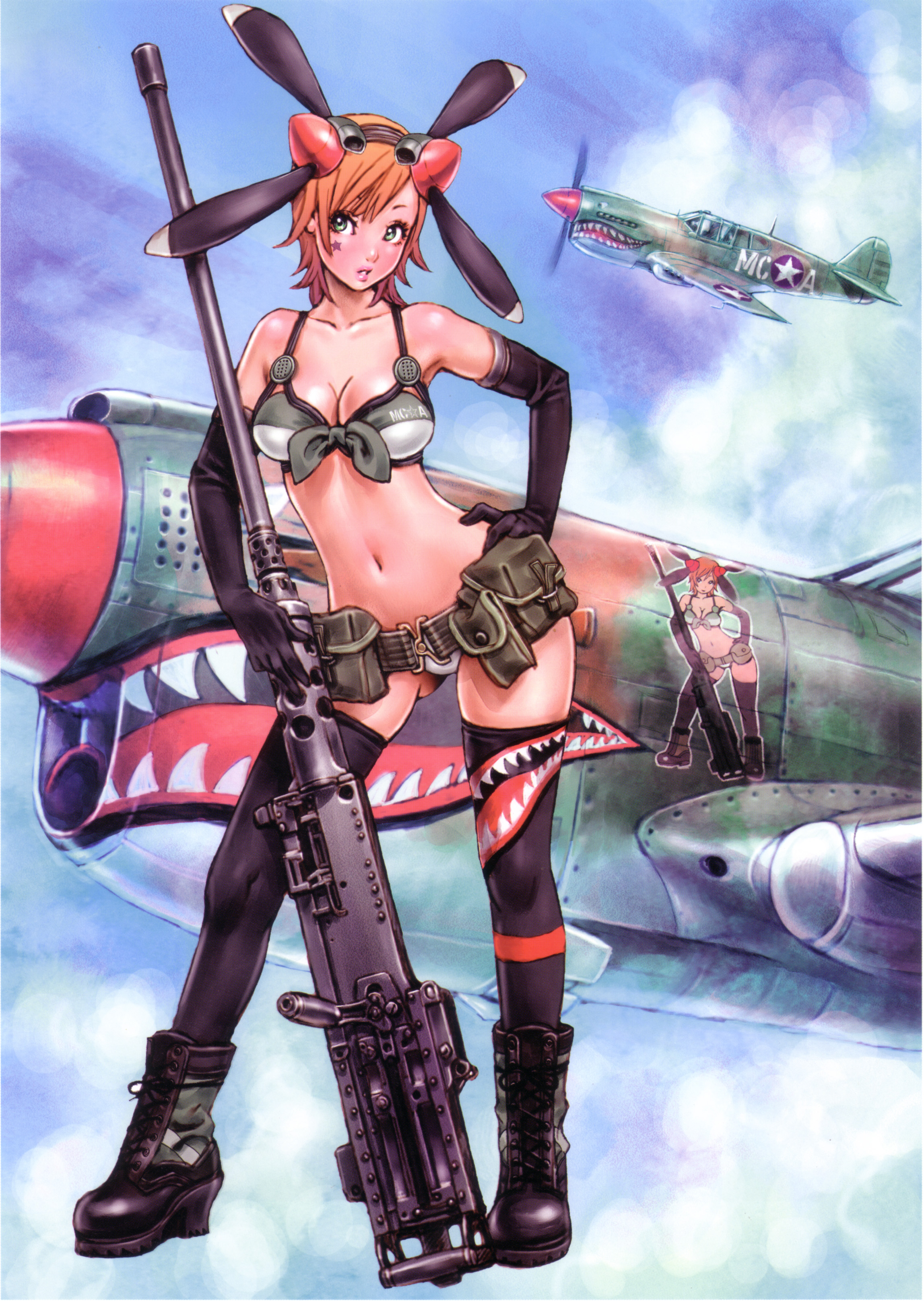1girlaircraftairplanebikinibootsbreastsbrowning m2cleavagecloudelbow glovesfemale focusfront-tie topglovesgreen eyesgunheavy machine gunmachine gunmedium breastsmilitary vehiclenose artorange hairpersonificationpropeller fightershark nose artshort hairsoloswimsuitthighhighsvehicle and personificationweapon