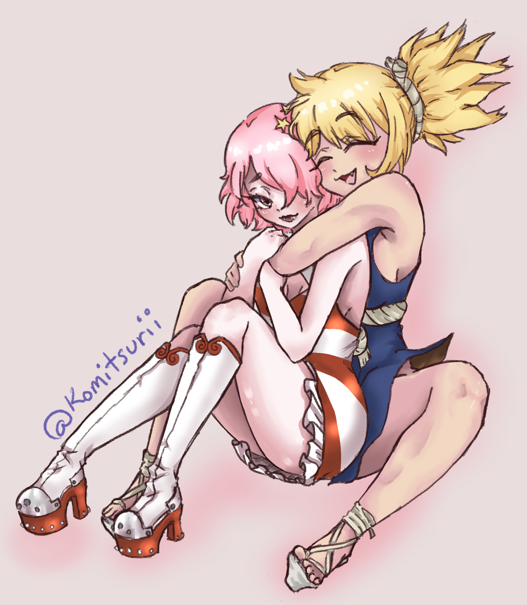 2girlsblonde hairblue dressbootsclosed eyesdressholdinghughug from behindkomitsuriimultiple girlsopen mouthponytailred eyessleevelesssmilespiked hairstar (symbol)thigh boots