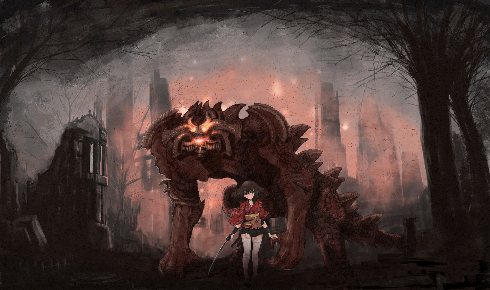 1girlarm guardsbrown eyesbrown haircitydemonfiregarter strapsglassesglowingjapanese clotheskatanakimonokimono skirtlegsshort hairskirtsmileswordthighhighsweaponwhite thighhighszettai ryouiki