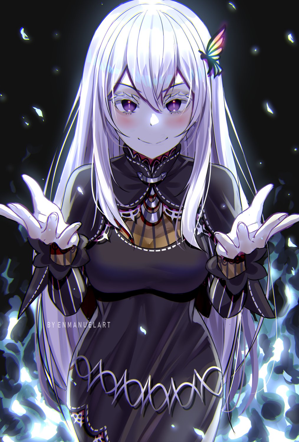 1girlartist nameblack backgroundblack capeletblack dressblue fireblushbreastsbutterfly hair ornamentcapeletclosed mouthcowboy shotdot nosedresseyelashesfirehair between eyeshair ornamentlarge breastslight particleslong hairlong sleeveslooking at viewerpurple eyespurple hairreachingreaching towards viewersidelockssmilesolovery long hairwatermark