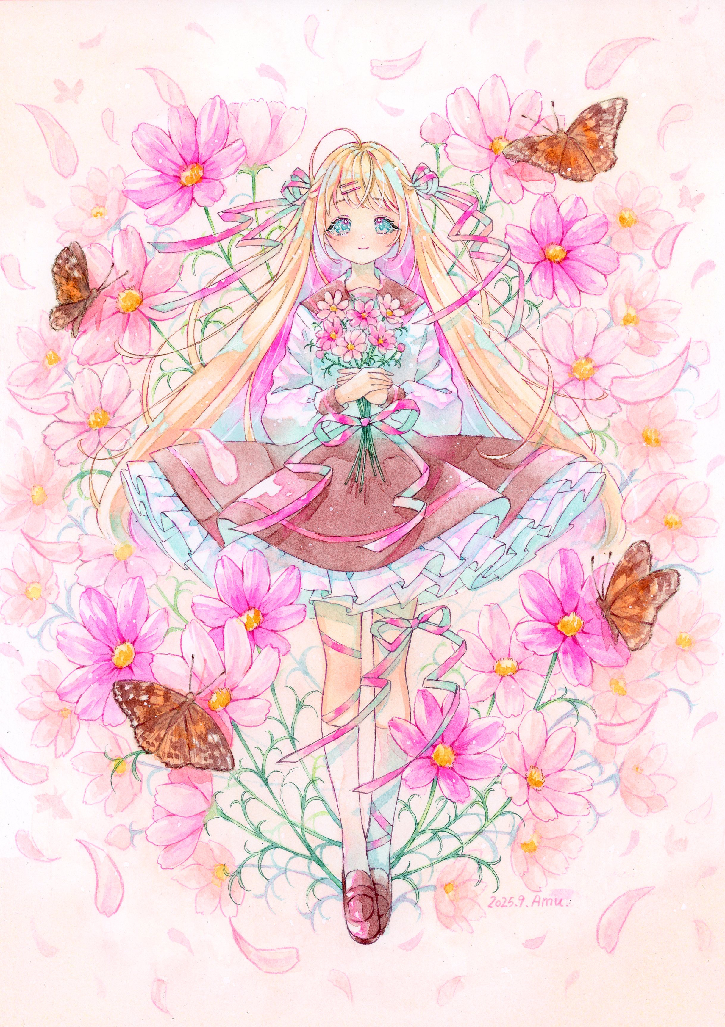 1girlahogeanimalaqua eyesartist nameblushbrown collarbrown shoesbrown skirtbugbutterflyclosed mouthcollarcosmos (flower)dateddot noseflowerfrilled skirtfrillshair ornamenthairclipholdingholding flowerinsectkneehighsleg ribbonloaferslong hairlooking at viewerown hands togetherparted bangspetalspink backgroundpurple ribbonribbonshirtshoessidelockssignaturesimple backgroundskirtsmilesockssolovery long hairwhite shirtwhite socks