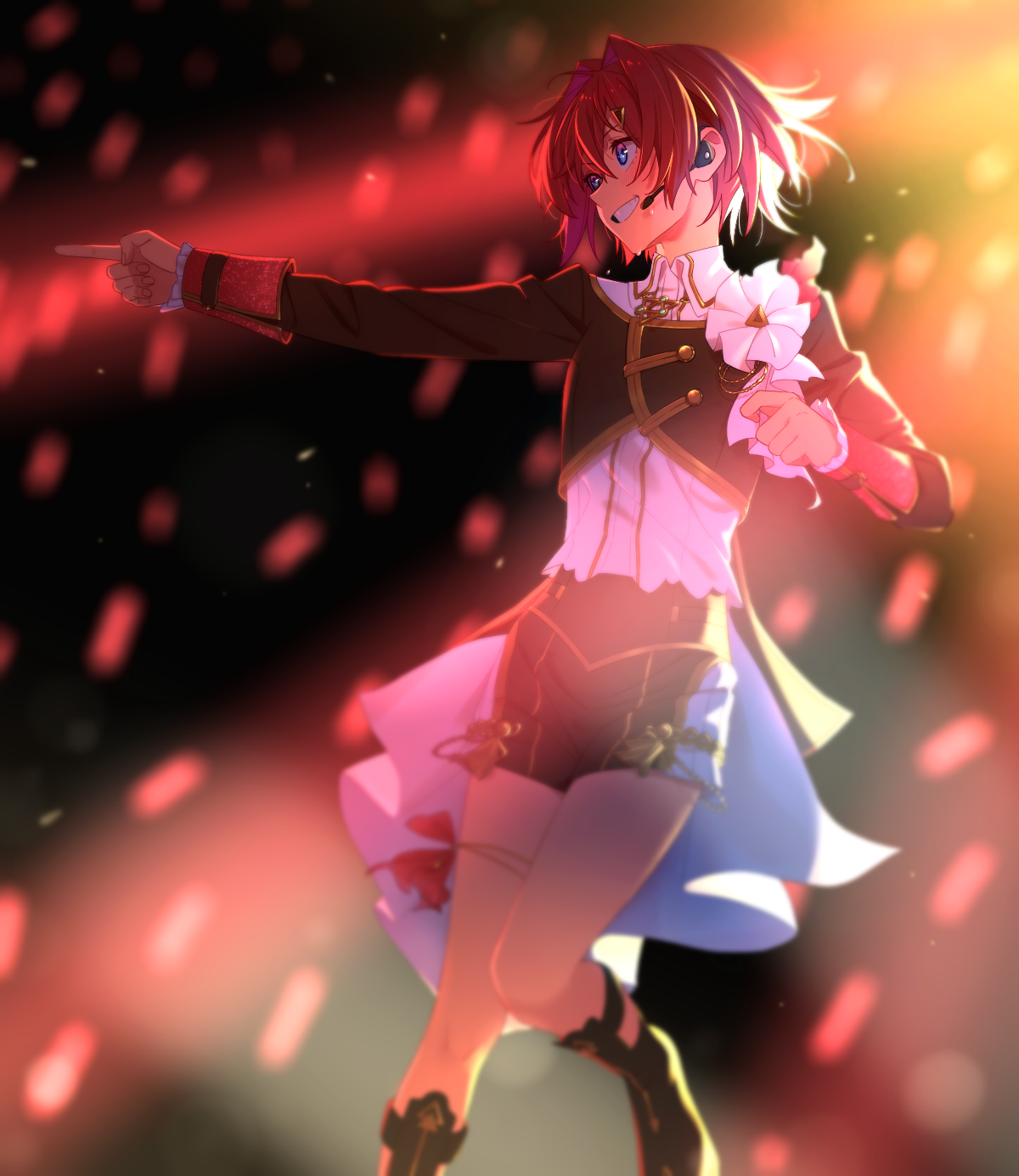 1girlankle bootsblack bootsblack shirtblack shortsblurryblurry backgroundbootscollared shirtdesign speculationfoot out of framegold trimhair between eyeshair intakeshair ornamenthands upheadsetidol clothesknees together feet apartlayered shirtlong sleevesnijisanji idol uniformpointingred hairshirtshort hairshortssleeve cuffssolostandingtasselthigh straptriangle hair ornamentvirtual youtuberwhite shirt