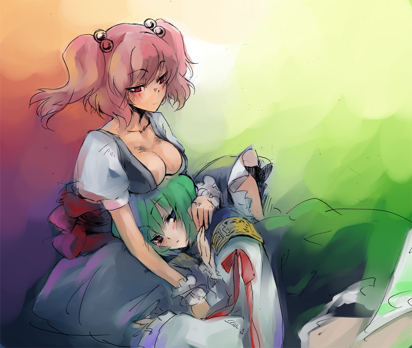 2girlsbreast restbreastsbreasts on headcleavagefemale focusgreen hairlap pillowlarge breastsmultiple girlsred hairribbonshort hair