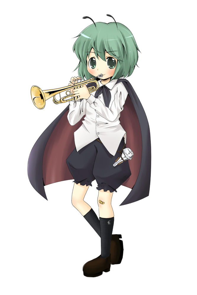 1girlantennaefemale focusfull bodygreen hairinstrumentmusicshort hairsimple backgroundsolotrumpetwhite background