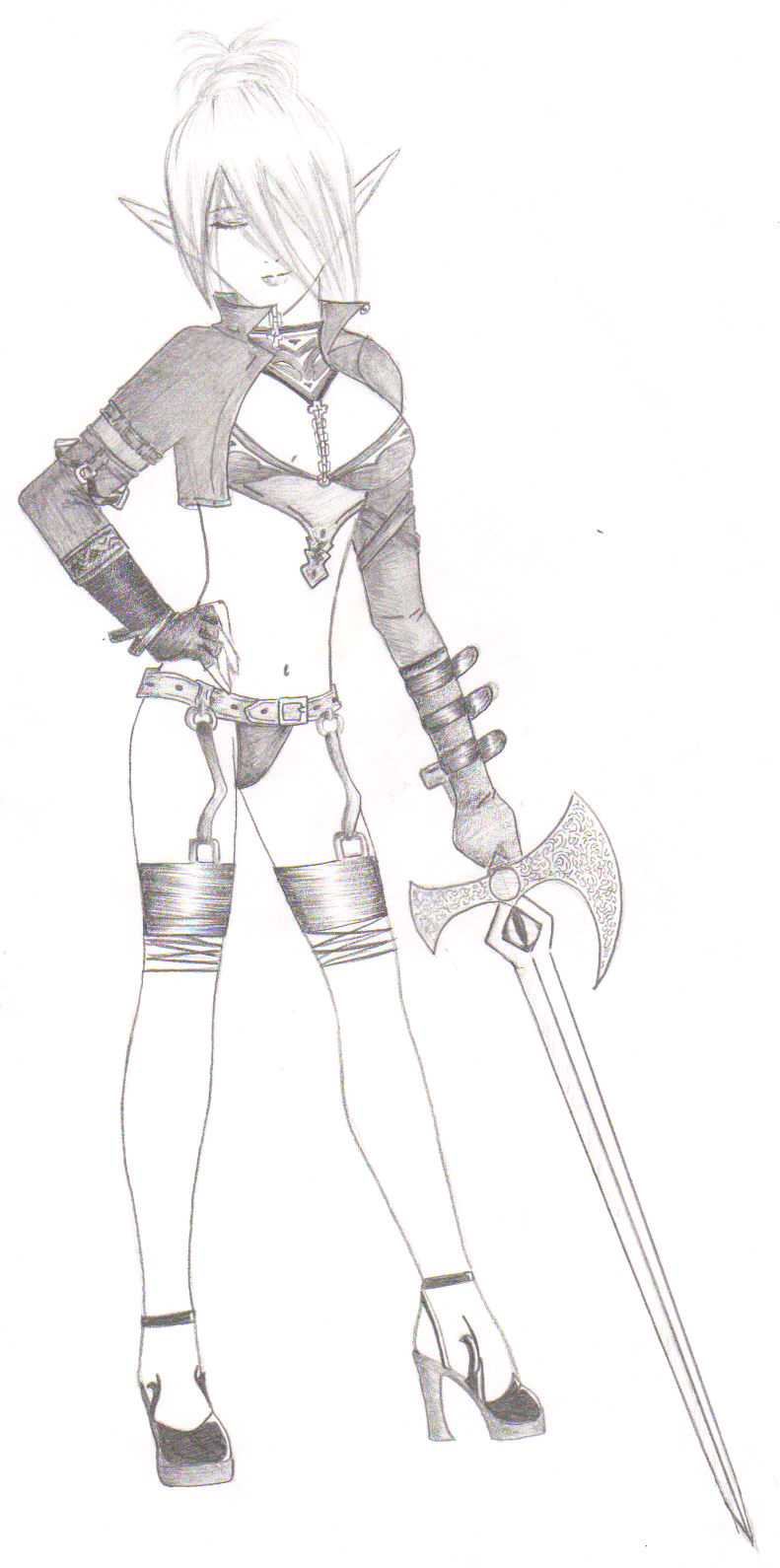1girlbad anatomyclosed eyesdarkdark elfelffemale focushair over one eyehigh heelsmonochromepointy earspoorly drawnsoloswordthighhighsweapon