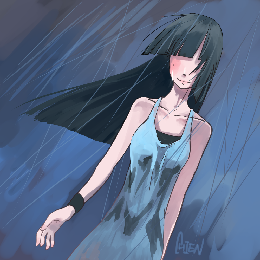 armbandbare shouldersblack hairblunt bangscollarbonedressdutch anglehair over eyeslong hairno eyesrainsignaturesmiletearswetwindwristband