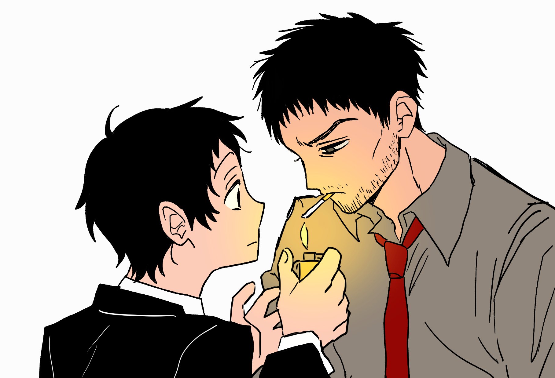 2boysblack haircigaretteclosed mouthcollared shirtfacial hairfiregrey eyesgrey shirtholdingholding lighterlighterlighting cigarettelong sleeveslooking at anothermale focusmouth holdmultiple boysnecktieqnfrjswjsrmflared necktieshirtshort hairsimple backgroundstubbleunlit cigarette in mouthupper bodywhite background