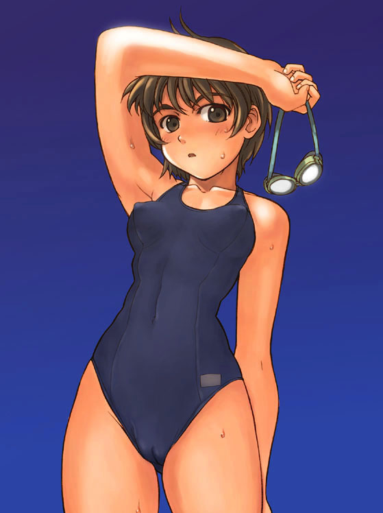 1girlblue backgroundbreastsbrown eyesbrown haircameltoecovered erect nipplesfemale focusone-piece swimsuitschool swimsuitshort hairsoloswimsuitwet