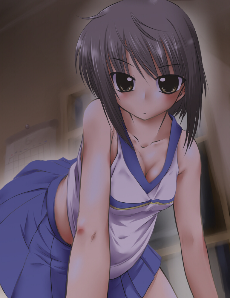 haruyama kazunori, kamishiro mana, kishin taisen gigantic formula, 00s, 1girl, bent over, black hair, breast press, breasts, downblouse, female focus, hair ribbon, long hair, panties, pantyshot, ponytail, red eyes, ribbon, school uniform, serafuku, small breasts, solo, underwear