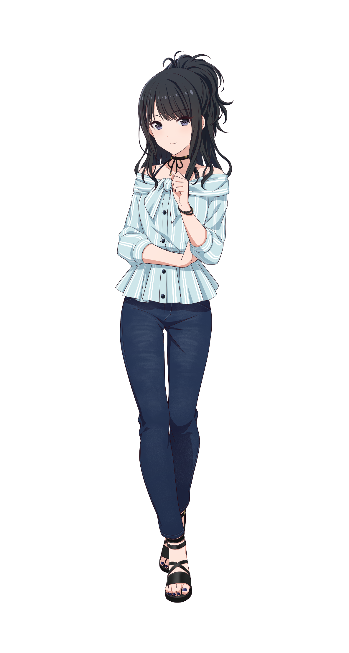 1girlblack hairblue eyesbraceletbuttonsholding own armjewelrynail polishpantsponytailsandalssolotoestransparent background