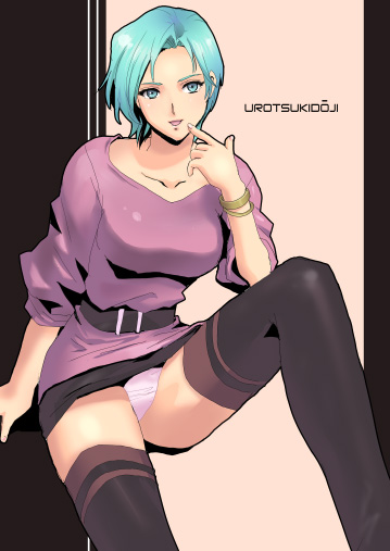 1girlaqua eyesaqua hairbeltblack thighhighsblue eyesblue hairbraceletfemale focusfinger to mouthjewelrymatching hair/eyesminiskirtpantiespantyshotpencil skirtpink pantiesshort hairsittingskirtsleeves pushed upsmilesolosweaterthighhighsunderwearzettai ryouiki