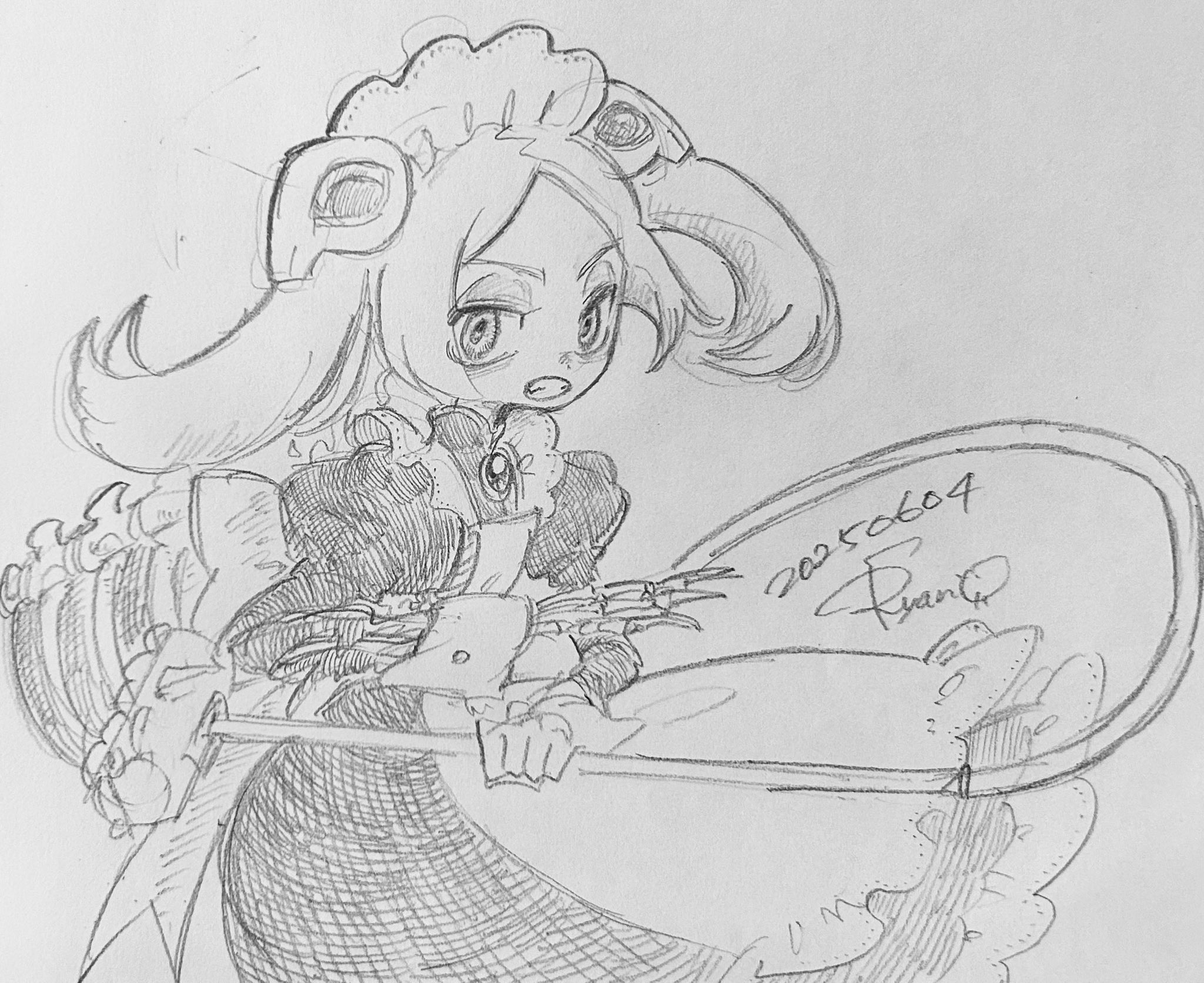 1girl2025apronbroochclenched teethdateddressfrilled apronfrilled dressfrillsgrey hairgreyscalehair ornamentjewelryjuliet sleeveslong sleeveslooking at viewermaid headdressmonochromeopen mouthpuffy sleevesskeletal handskull hair ornamentsoloteethtwintailsvacuum cleaner