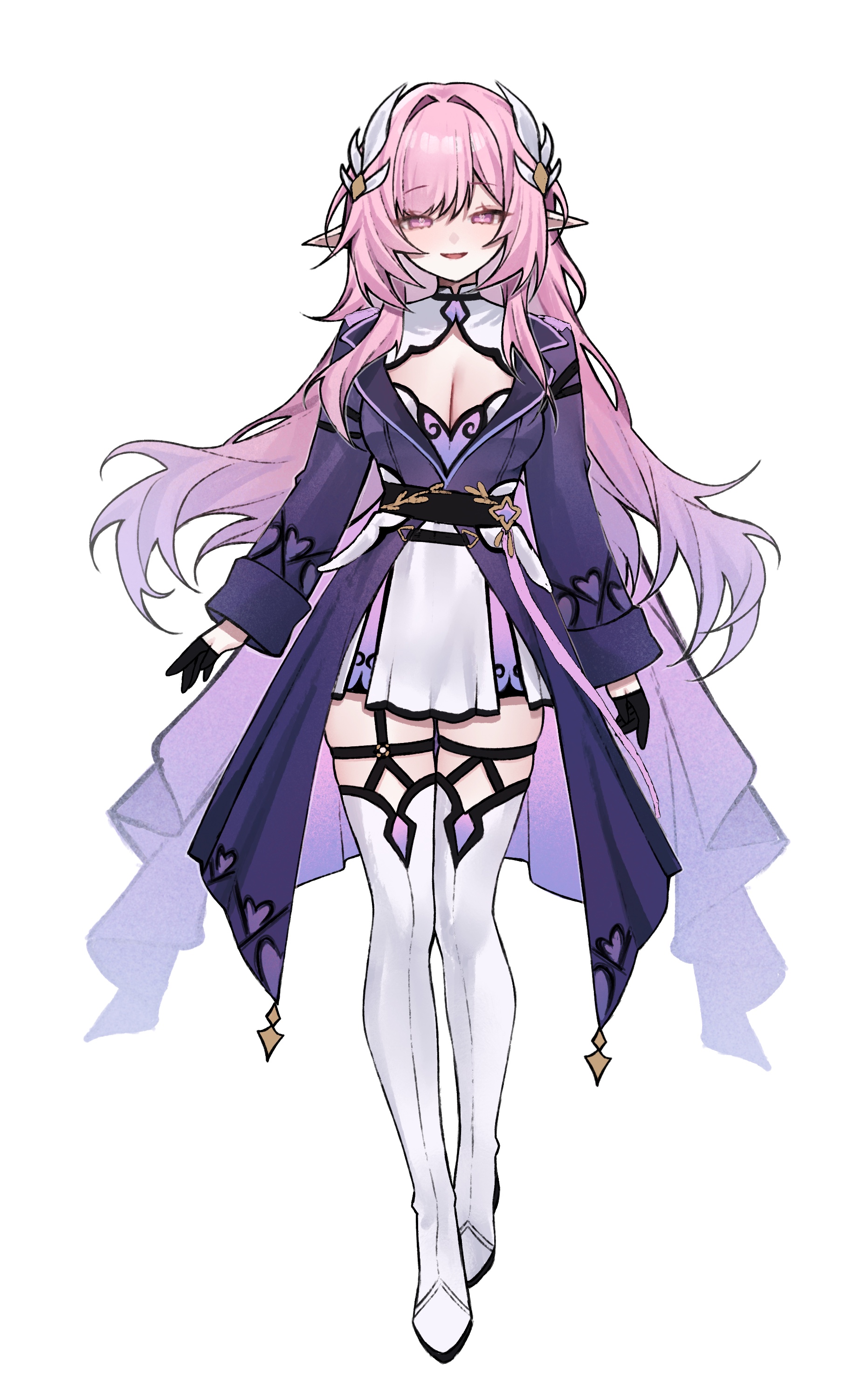 1girladapted costumealternate costumeblack glovesbootsbreastscleavagecoatcyrene (aedes elysiae) (honkai: star rail)dressfull bodyglovesgradient hairhair ornamenthalf gloveslooking at viewermedium breastsmulticolored hairparted lipspink eyespink hairpointy earspurple coatself cosplaysidelockssimple backgroundsmilesolothigh bootsthighswhite backgroundwhite bootswhite dress