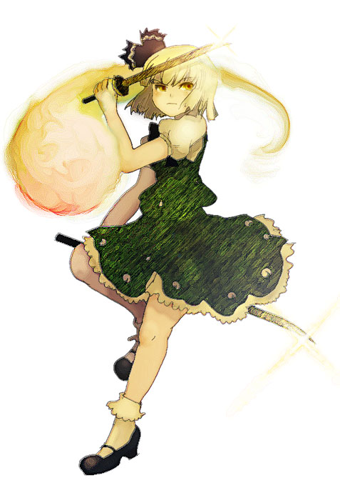 1girlbob cutbobby socksdual wieldingfemale focusfull bodyhairbandholdingkatanamary janesshoessimple backgroundsockssoloswordweaponwhite hairyellow eyes