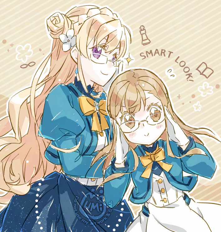 1boy2girlsadjusting eyewearaqua jacketblonde hairblue skirtblushbreastsbrown eyesbrown hairclosed mouthcorsetcropped jacketdouble bunenglish texteyebrows hidden by hairflat chestglassesgloveshair bunjacketlong hairlooking at viewermultiple girlsofficial alternate hairstylepurple eyesschool uniformskirtsmall breastssmilevery long hairwhite corsetwhite gloveswhite skirt