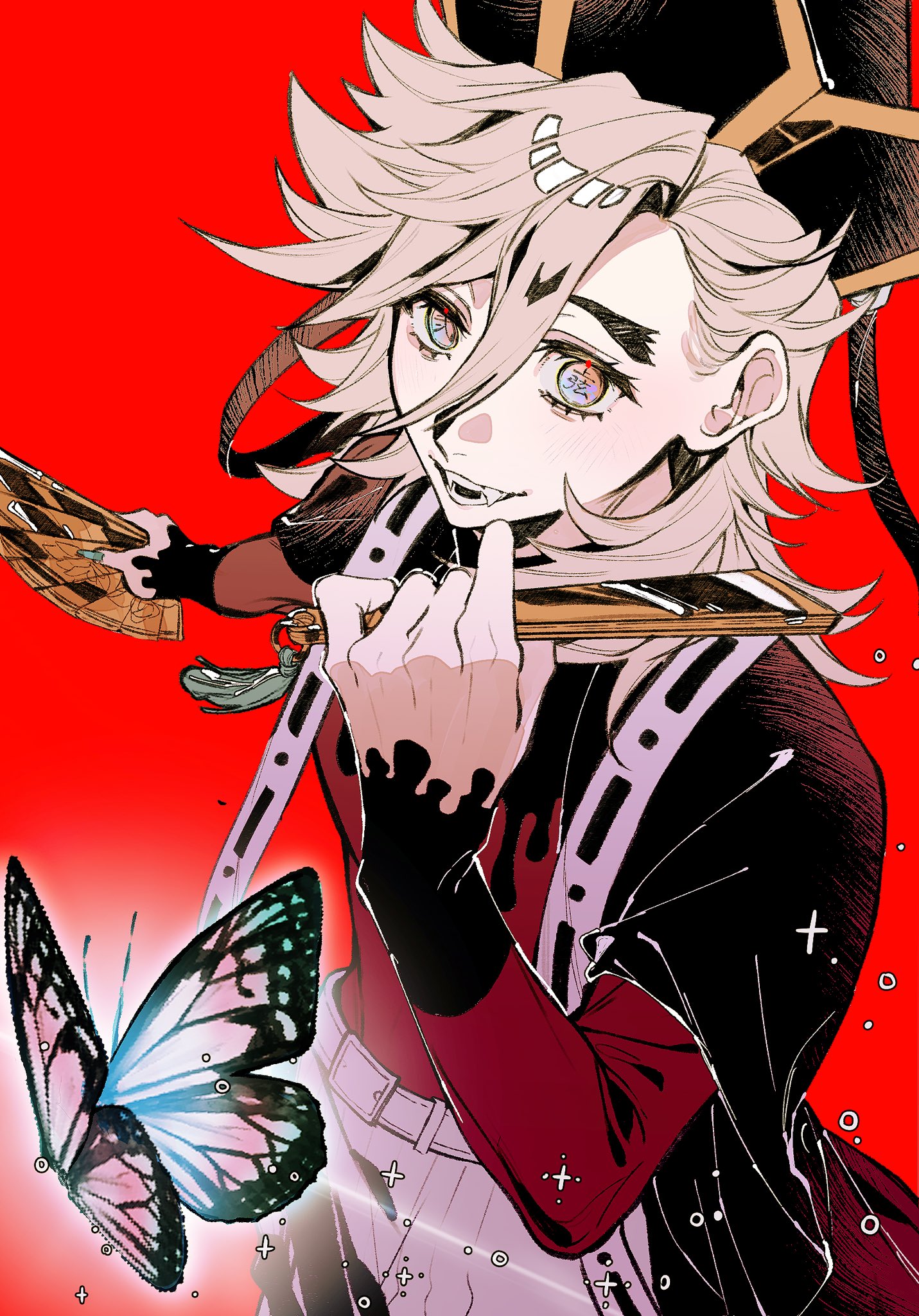 1boybeltblack hatblonde hairblue eyesbugbutterflyhair between eyeshand fanhand uphatholdingholding faninsectlong hairlong hair between eyeslooking at viewermale focusmulticolored eyespantspink eyesred backgroundred shirtshirtsimple backgroundsolospiked hairtwo-tone eyeswhite beltwhite pants