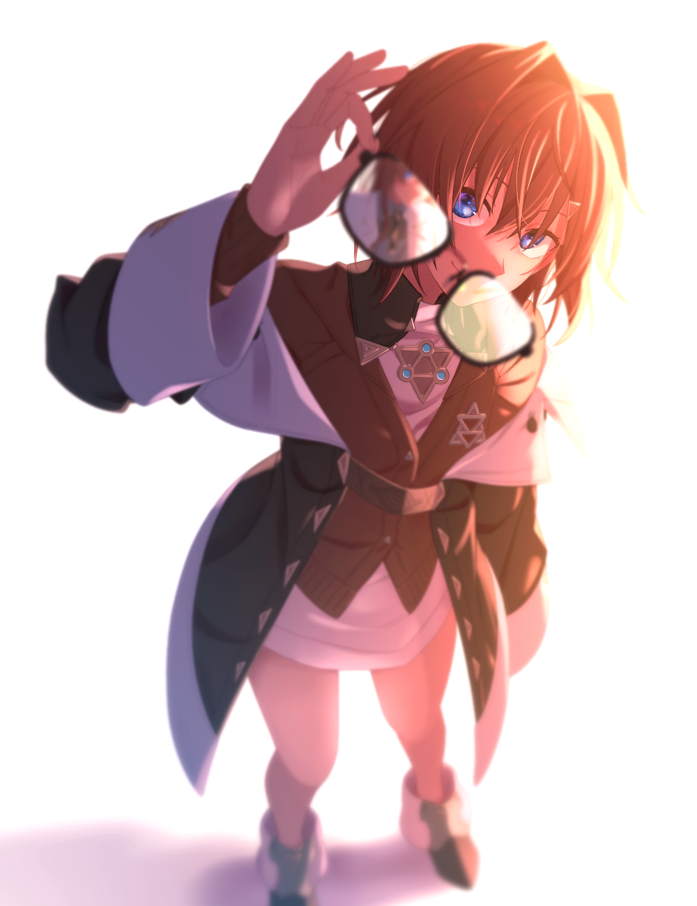 1girlankle bootsarm upblack coatblue eyesblurrybootscardiganclosed mouthcoatcollared dressdepth of fielddressflat chestfull bodyhair intakeshair ornamentholdingholding removed eyewearlong sleeveslooking at vieweroff shoulderred cardiganred hairrevealing layershadowshort dressshort hairsimple backgroundsmilesolotriangle hair ornamentunworn eyewearvirtual youtuberwhite backgroundwhite dress