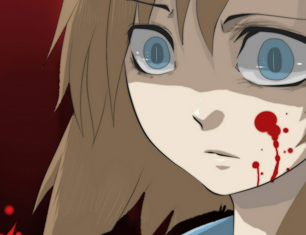 00s1girlbloodblood on faceblood splatterblue eyesbrown hairclose-upcrazy eyesfemale focusgradient backgroundorange hairsoloyandere