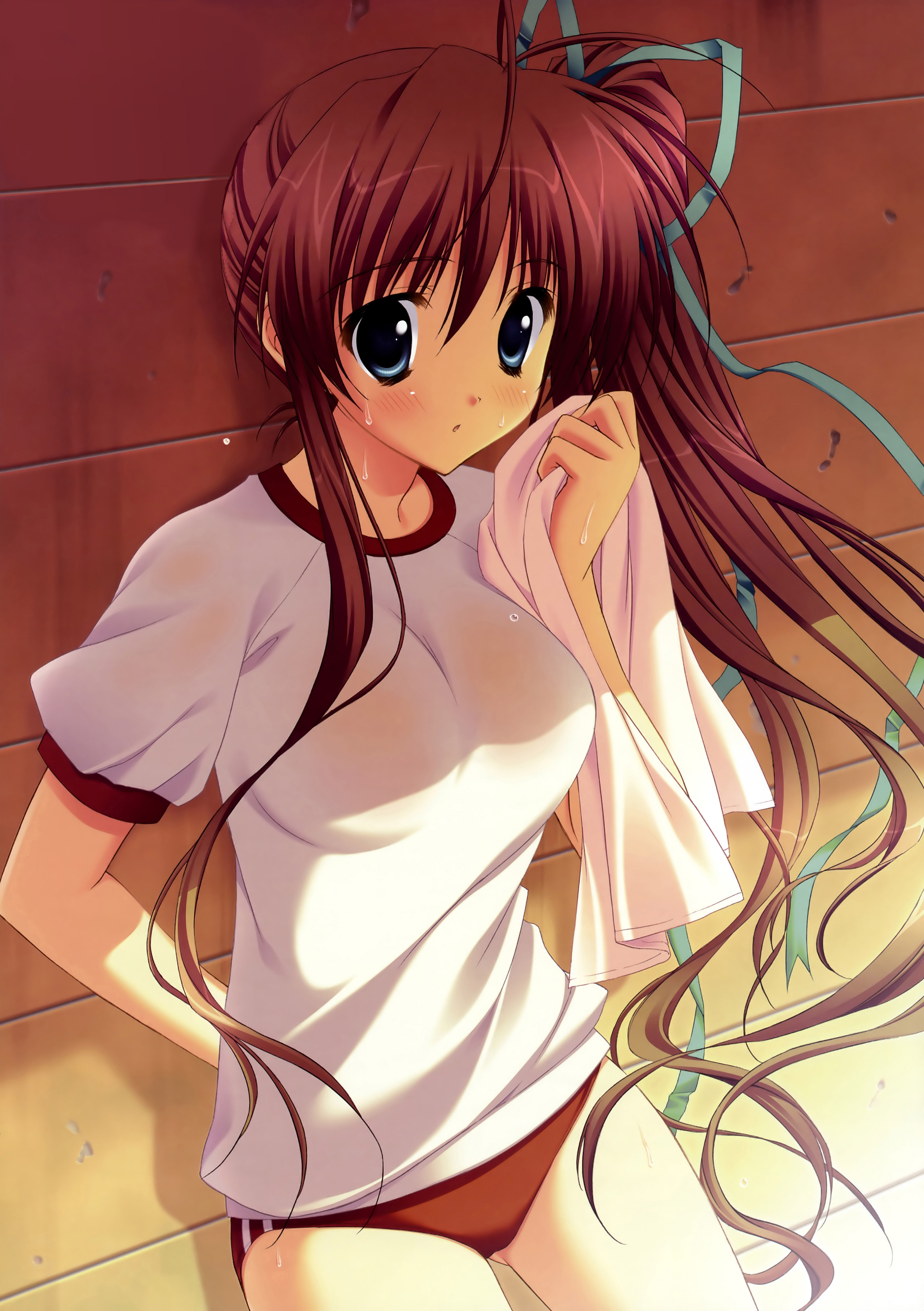 1girlblue eyesbrown hairburumafemale focusgym uniformlong hairponytailribbonsolotowelvery long hair