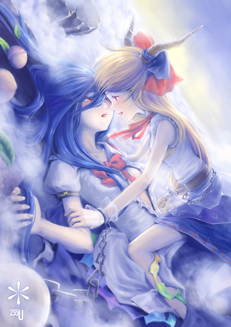 2girlsafter kissblonde hairblue hairchaincouplefemale focusfoodfruithornskisslong hairlyingmultiple girlsopen clothesopen shirtpeachred eyesribbonsalivasaliva trailshirttongueyuri