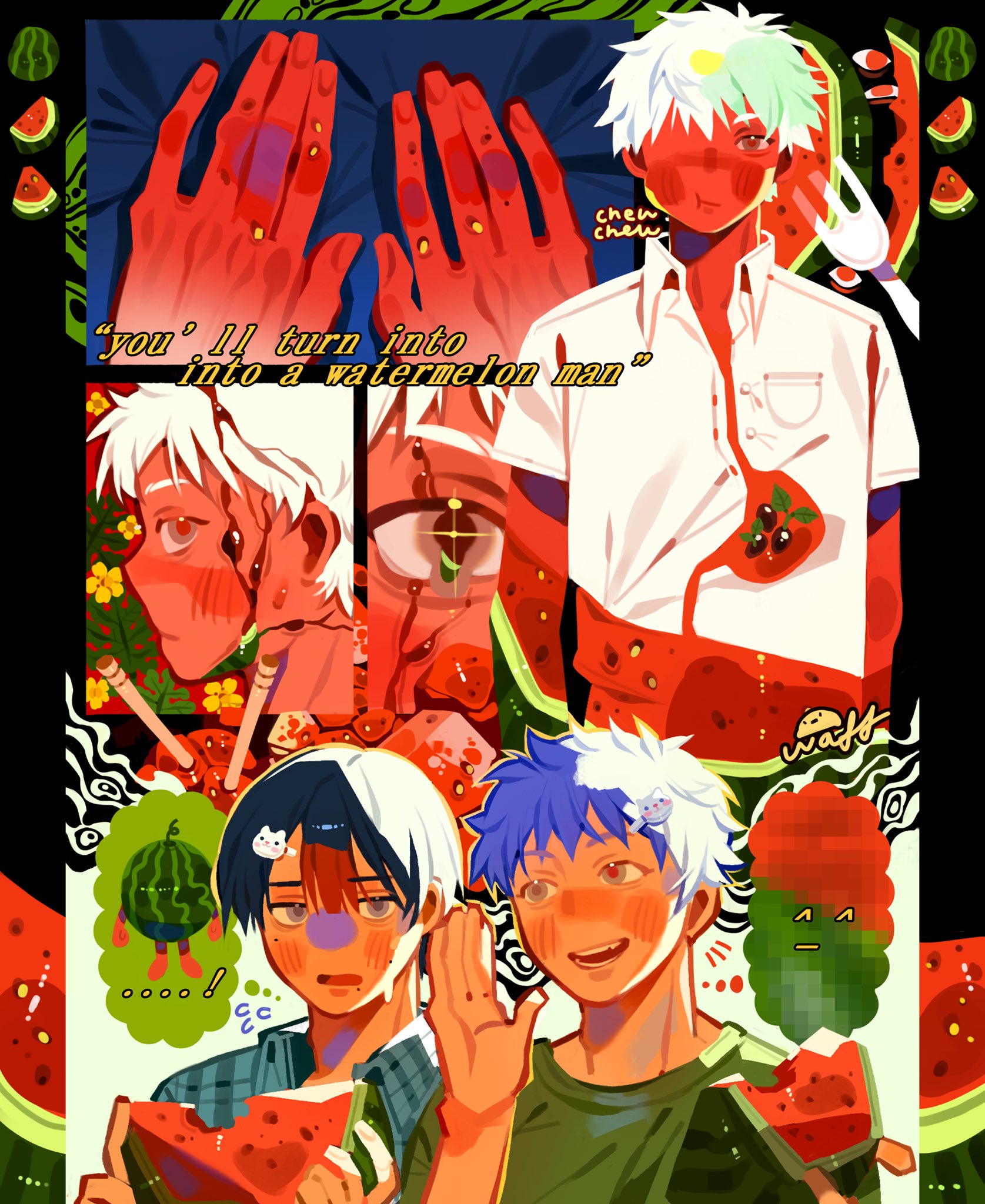 1boy2boysblack hairblushcheckered clothescollared shirtfoodfruitgreen shirthair ornamenthairclipmale focusmolemole on cheekmole under eyemole under mouthmultiple boysmultiple molesshirtshort hairwatermelonwatermelon slicewhite hairwhite shirt