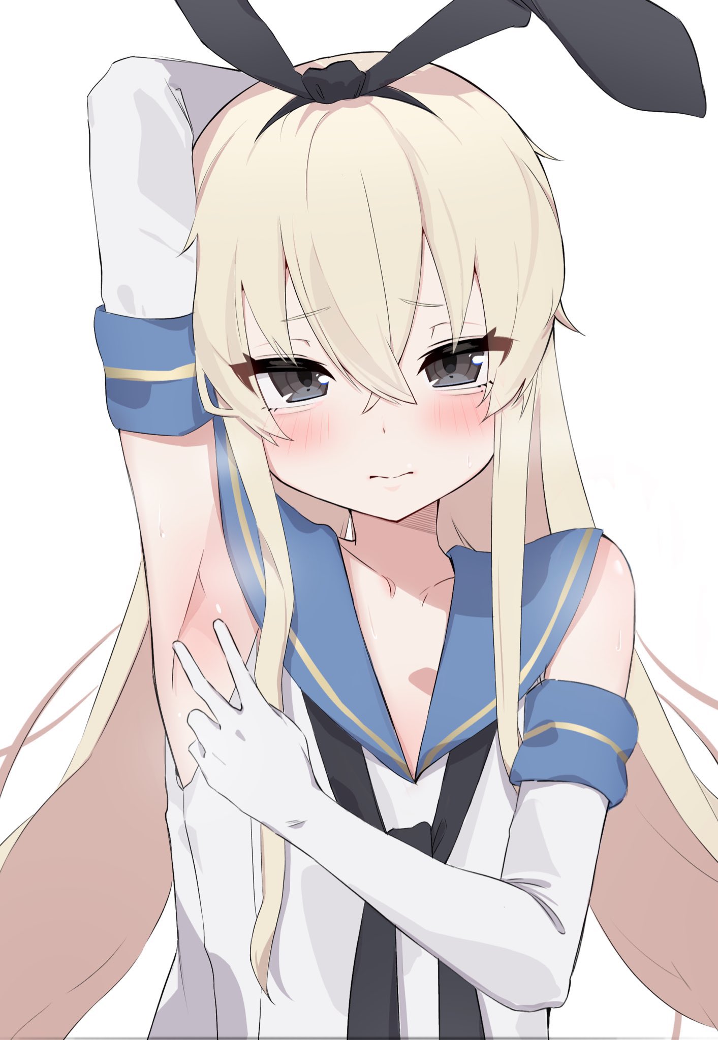 1girlarm behind headarm uparmpit focusarmpitsblack neckerchiefblonde hairblue sailor collarblushelbow glovesgloveshairbandlong hairlooking at viewerneckerchiefpresenting armpitsailor collarsimple backgroundsolospread armpitstriped clotheswhite backgroundwhite gloves