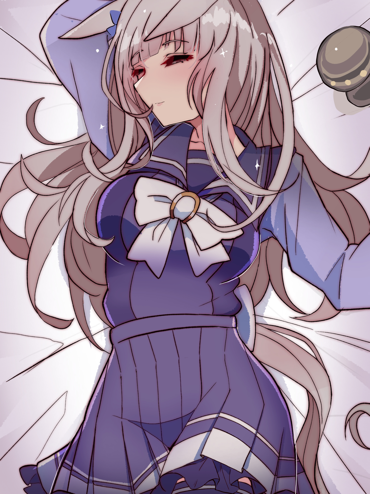 1girlanimal earsarm upbed sheetbowbreastsbrown hairclosed mouthear coversears downfrilled skirtfrillshalf-closed eyehorse earshorse girlhorse taillong hairlong sleeveslyingmedium breastson backone eye closedpleated skirtpuffy long sleevespuffy sleevespurple shirtpurple skirtpurple thighhighsschool uniformshirtskirtsolotailthighhighstracen school uniformvery long hairwhite bow