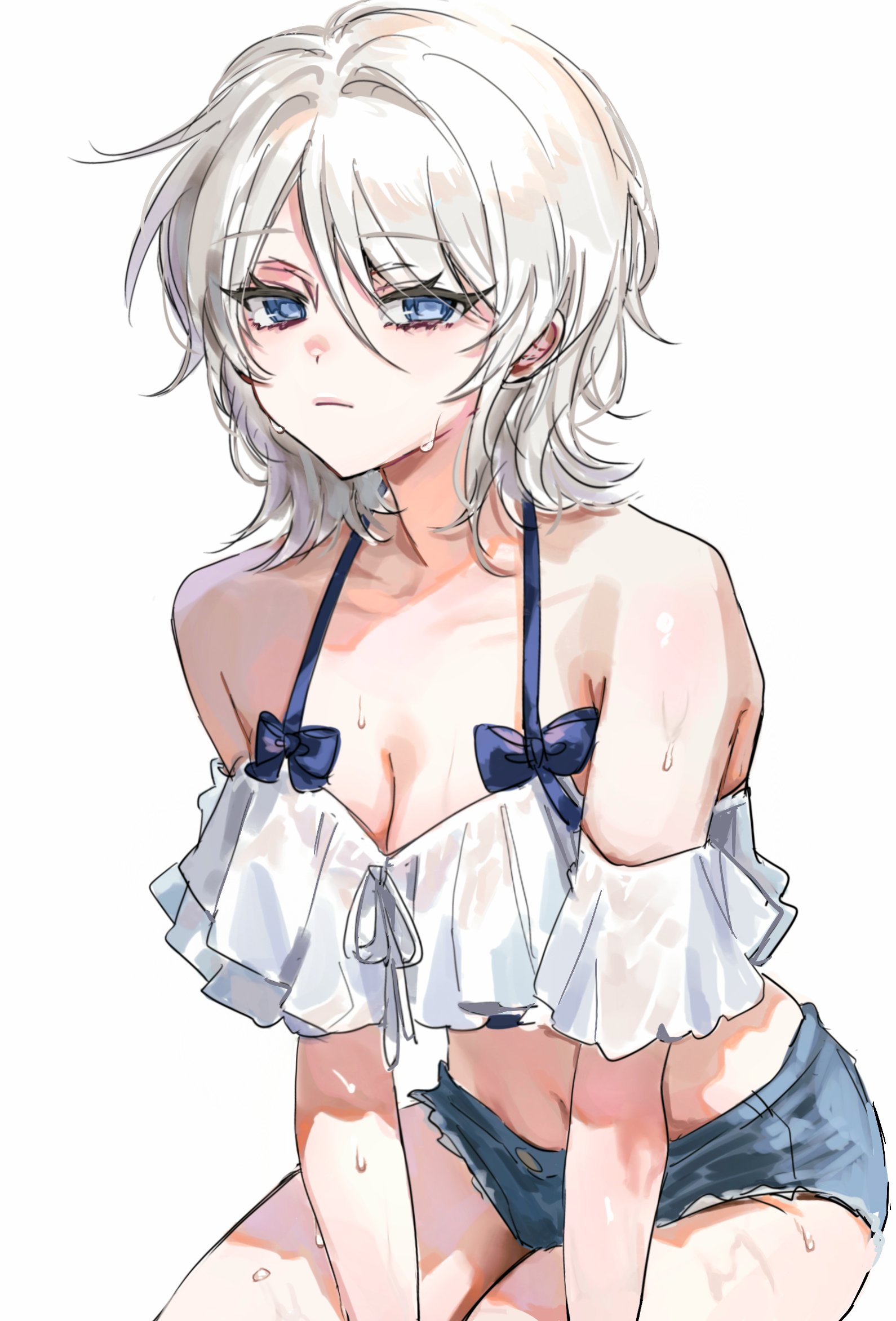 1girlalternate costumebikiniblue bowblue eyesbowbreastscleavageclosed mouthdenimdenim shortslooking at viewershort hairshort shortsshortssimple backgroundsittingsoloswimsuitupper bodywetwet clotheswhite backgroundwhite bikiniwhite hairwwwww 910