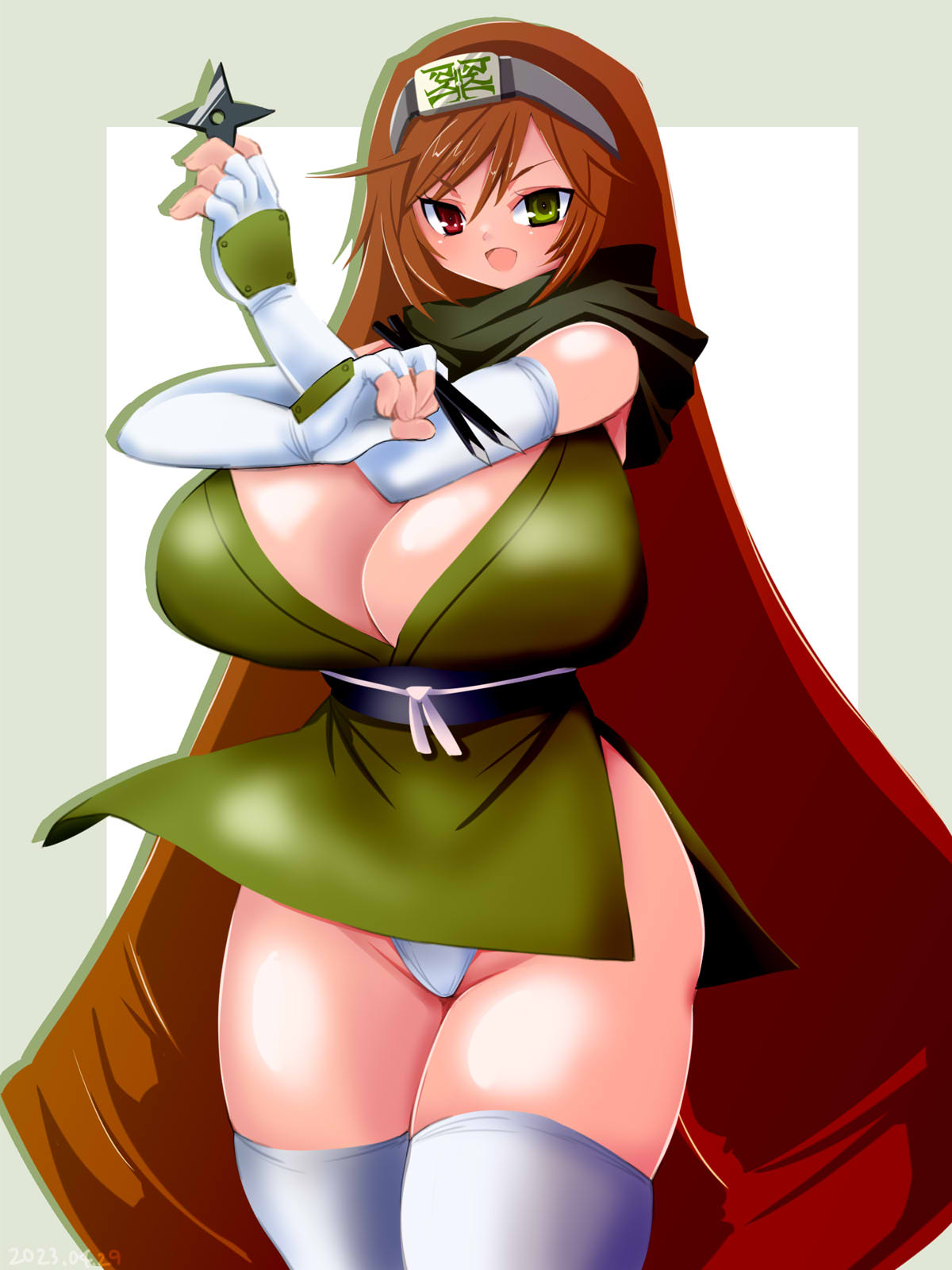 1girlalternate breast size (larger)alternate costumeblack sashblushbreastsbrown haircowboy shotdresselbow glovesfingerless glovesglovesgreen backgroundgreen dressgreen eyesgrey headbandheadbandheterochromiaholdingholding shurikenholding weaponhuge breastslong hairlooking at viewerninjaobiopen mouthpantiespantyshotred eyessashshort dressshurikensmilesolothick thighsthighhighsthighstwo-tone backgroundunderwearvery long hairweaponwhite pantieswhite thighhighs