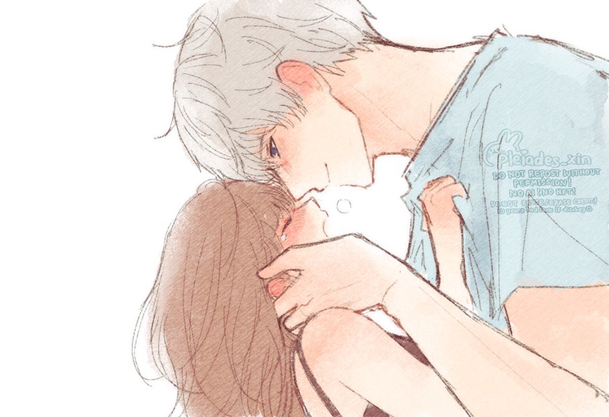 1boy1girlblack shirtblue shirtblushbrown hairclosed eyesclosed mouthcouplecryinggrey hairhair between eyeshand in another's hairhand on another's cheekhand on another's faceheterolong hairlooking at anotheropen mouthshirtshirt tugshort hairshort sleevessmilespaghetti strapt-shirttearstwitter usernameupper bodywhite background
