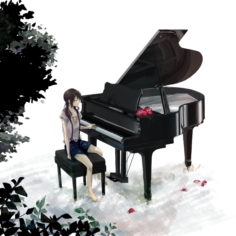barefootblouseflowergrand pianoinstrumentmessy hairpianopiano benchshirtshortssittingsolowhite backgroundwhite shirt