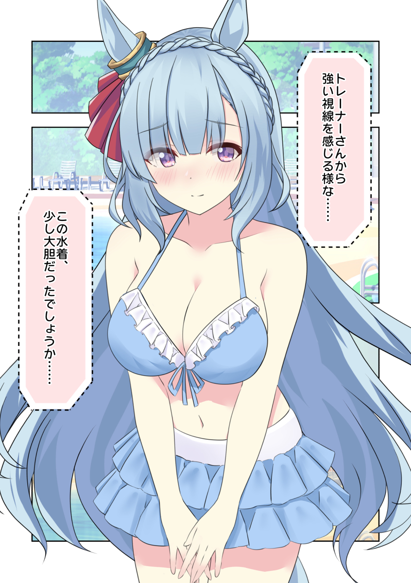 1girlanimal earsbare shouldersbikinibikini skirtblue bikiniblue hairblushbraidbreastscleavageclosed mouthcollarbonecrown braidear ornamenthorse earshorse girlhorse taillarge breastslong hairlooking at viewermidriffnaveloutdoorspoolpurple eyessmilesolospeech bubbleswimsuittailwater