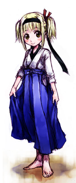 1girlbarefootblonde hairblue hakamablushfeetfemale focushakamahakama skirtheadbandjapanese clothesshort hairsketchskirtsmilesolotwintailsyellow eyes