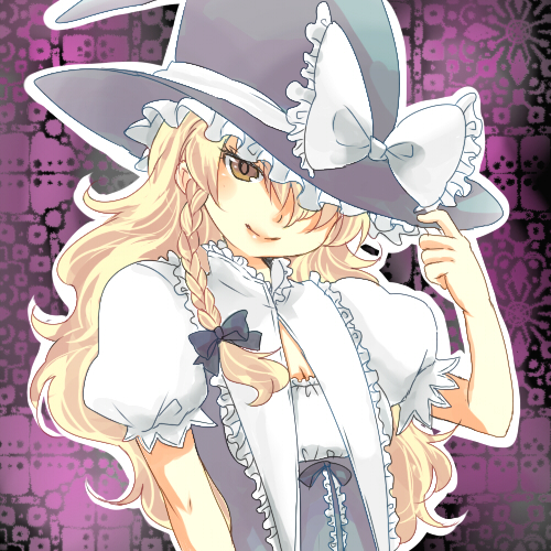 1girlalternate costumeblonde hairbowbraidfemale focusfrillshair bowhand on headwearhathat bowlong hairside braidsingle braidsmilesolowitchwitch hatyellow eyes