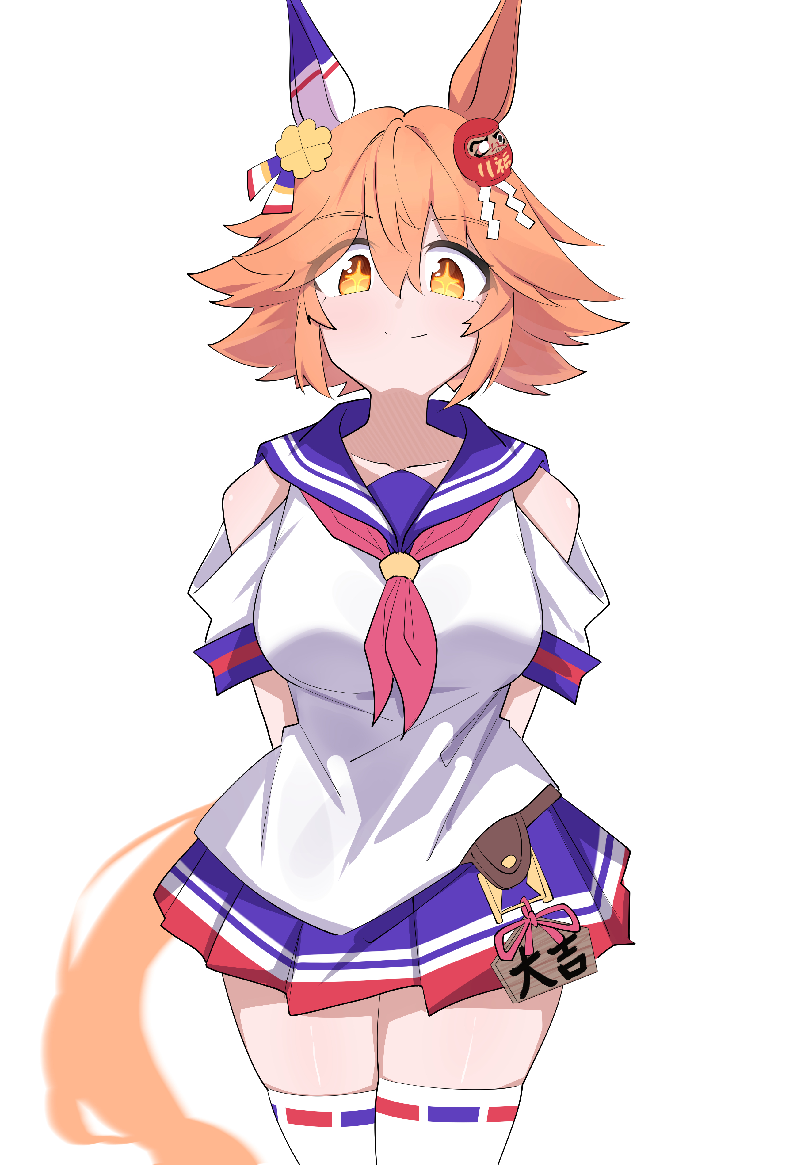 1boy1girlanimal earsarms behind backblue skirtblushbreastsclosed mouthclover hair ornamentcowboy shotdaruma dollear coversemaflipped hairhair ornamenthorse earshorse girlhorse tailjewelrylooking at viewermedium breastsneckerchieforange eyesorange hairpleated skirtred neckerchiefschool uniformserafukushirtshort hairshortssimple backgroundsingle ear coverskirtsmilesolotailthighhighswhite backgroundwhite shirtwhite thighhighs